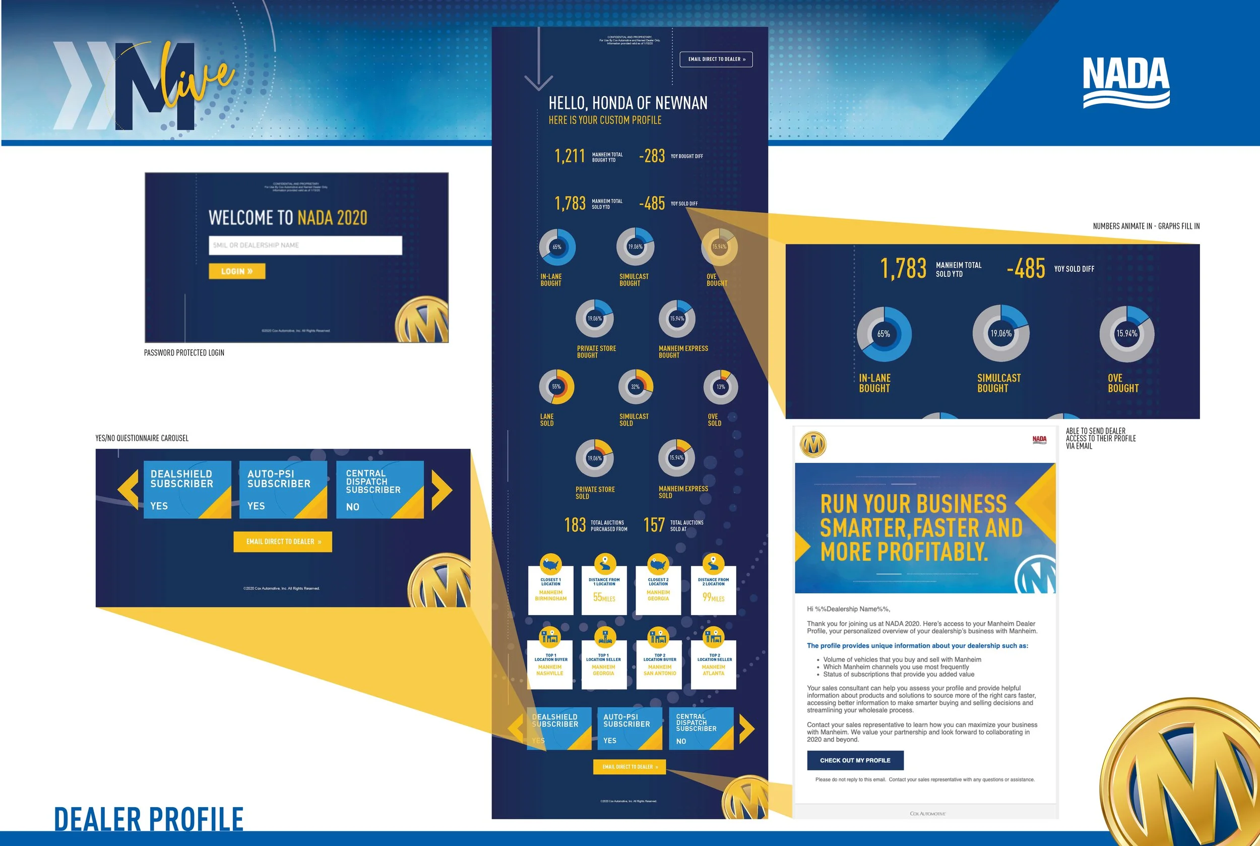 When Manheim approached our team ahead of NADA 2020, their goal was simple—but powerful: help dealers see the full picture of their partnership in one glance. Each client needed a personalized profile that reflected their business performance with Manheim, while also showcasing the company’s technology-driven vision. The challenge was transforming raw data into a visually engaging, easy-to-grasp story—all powered by realtime automation.